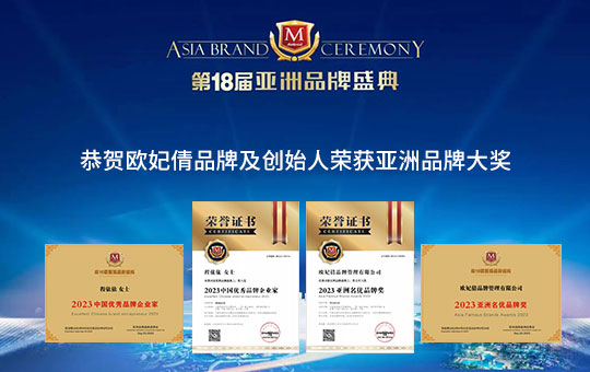 恭賀歐妃倩品牌創始人程依依女士榮獲2023“中國品牌優秀企業家”獎! 恭賀歐妃倩品牌榮獲2023“亞洲名優品牌”獎!